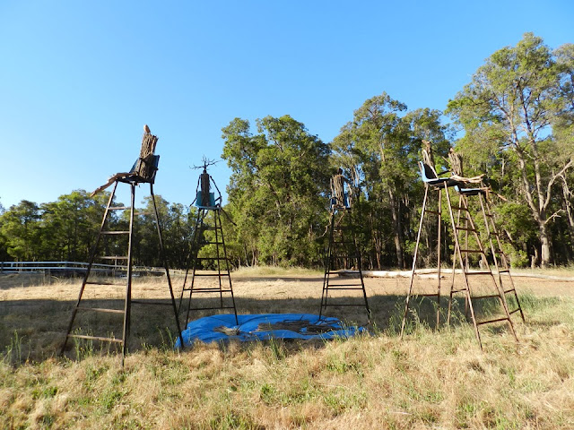 I made one commitment to producing artwork while I was in Australia this year, and that was to make a piece for Tarpspace, a project that called on artists to use a tarp as part of an installation or performance piece. As I walked through the piles of material behind the workshed at Zia Park, my sister Gail's equestrian center in Gidgegannup, my eye was caught by all the things that were tarp blue -- plastic tubs, old toys, and five fabulous tall chairs that might have been used for judging stands, or maybe for lifeguards at a pool. Zia Park has a wonderful cross-country course with all kinds of interesting jumps that are fun, colorful, and creative, so they accept materials that might turn into jumps somewhere down the line, and I expect that these chairs came to Zia Park in that way.